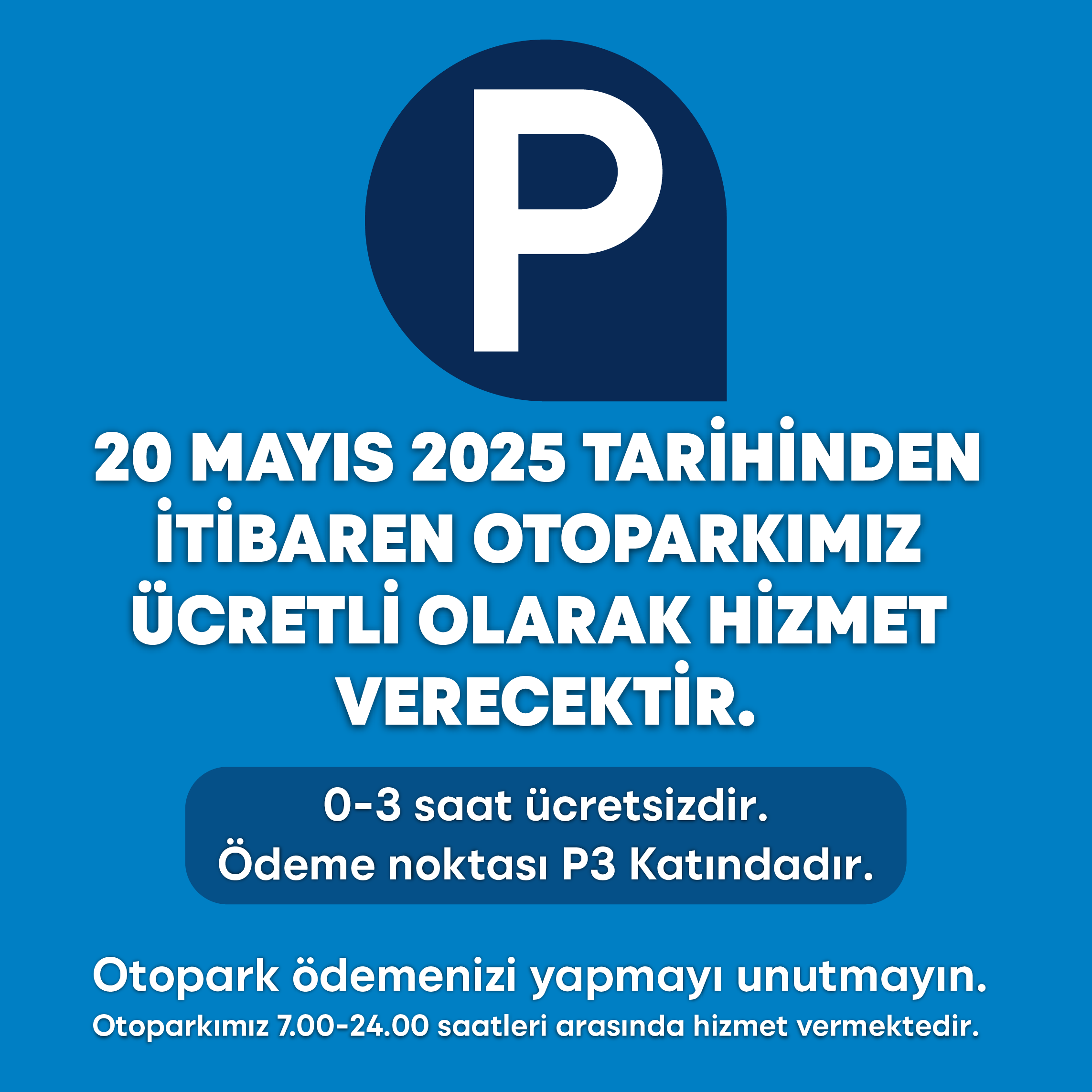 20 Mayıs 2025 tarihinden itibaren otoparkımız ücretli olarak hizmet verecektir.